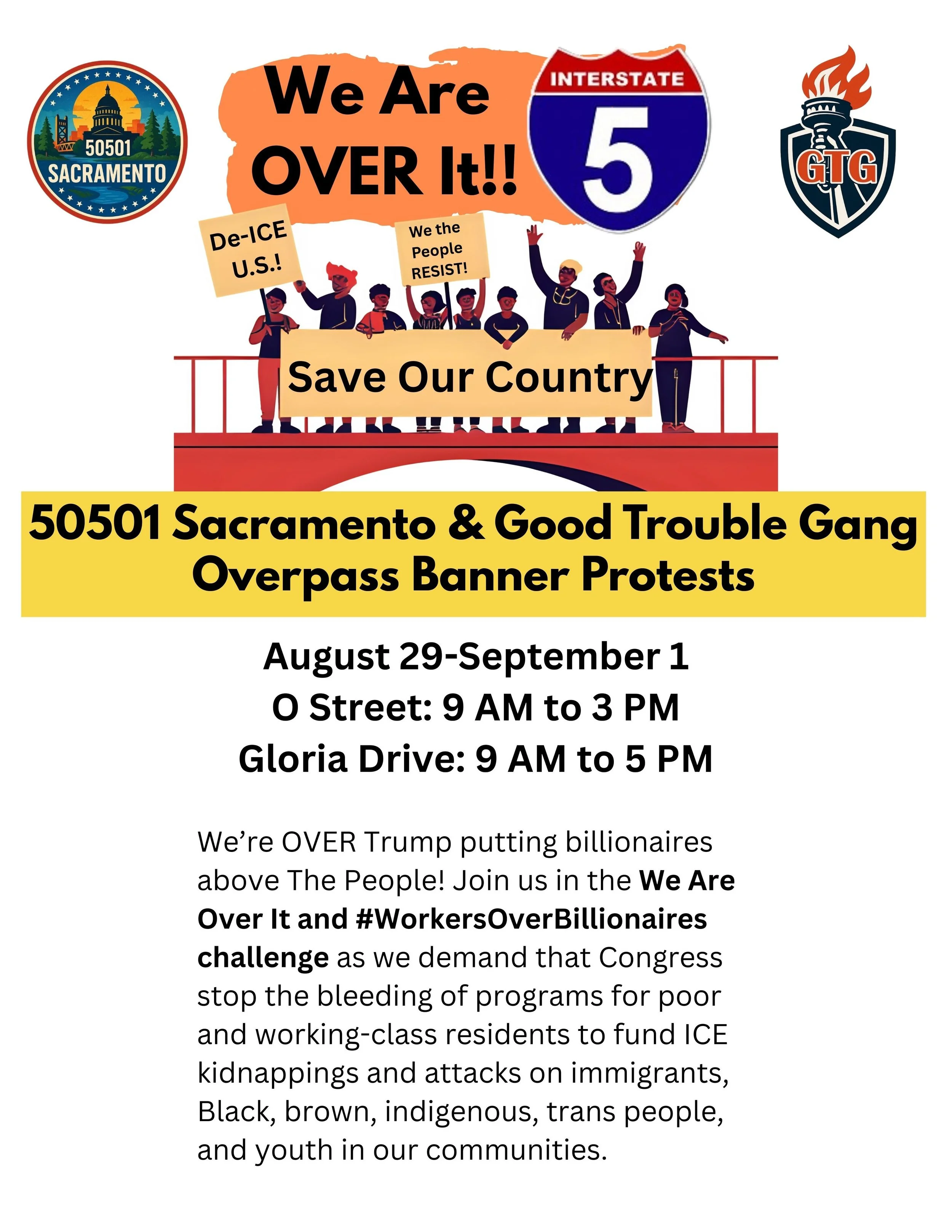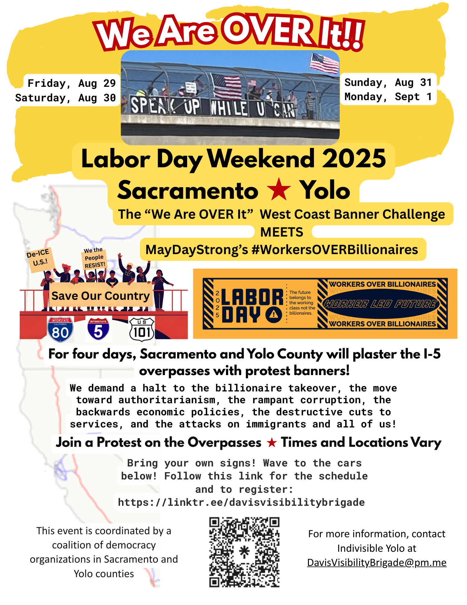 On Labor Day weekend, from Friday to Monday, groups from across the region will be deploying banners on overpasses up and down I-5 opposing ICE and the billionaire takeover. We Are Over It! aims to cover overpasses from Mexico to Canada with messages opposing ICE and showing support for immigrant communites and others targeted unjustly. Events organized by Indivisible Yolo, Davis Visibility Brigade, the Good Trouble Gang and 50501 Sacramento will cover overpasses in the Sacramento region.